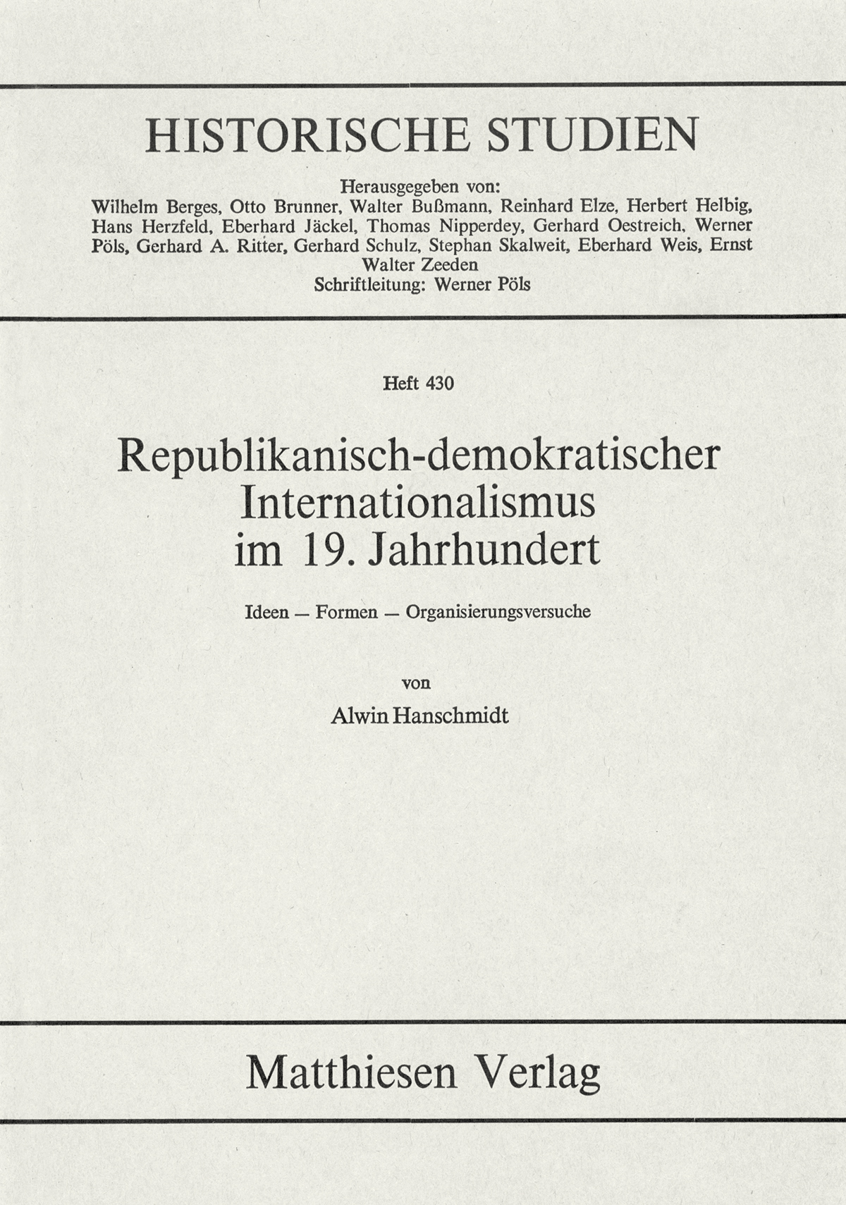 Zurückblickend auf die frühe Zeit des bürgerlichen Internationalismus inmitten einer Epoche, die europaweit maßgeblich vom Gedanken des Nationalismus geprägt war, gibt Alwin Hanschmidt einen Überblick über Ideen, Formen und Organisierungsversuche des Internationalismus der demokratisch-republikanisch gesinnten bürgerlichen Linken von der Französischen Revolution bis ins letzte Drittel des 19. Jahrhunderts hinein, wobei dessen ideengeschichtliche Seite im Selbstverständnis und Verhältnis zu Nationalismus, Liberalismus sowie Sozialismus berücksichtigt, aber der organisationsgeschichtlichen Perspektive untergeordnet wird. Zumindest bis zur Jahrhundertmitte hinsichtlich der Mittel bei der Demokratie ein Mäßigungsprozess einsetzte, beschränkte sich der Internationalismus der bürgerlichen Demokratie keineswegs darauf, seinen Einfluss über den Weg der Reform gültig zu machen: Vielmehr waren seine wichtigsten Instrumente Insurgentismus und Revolution.