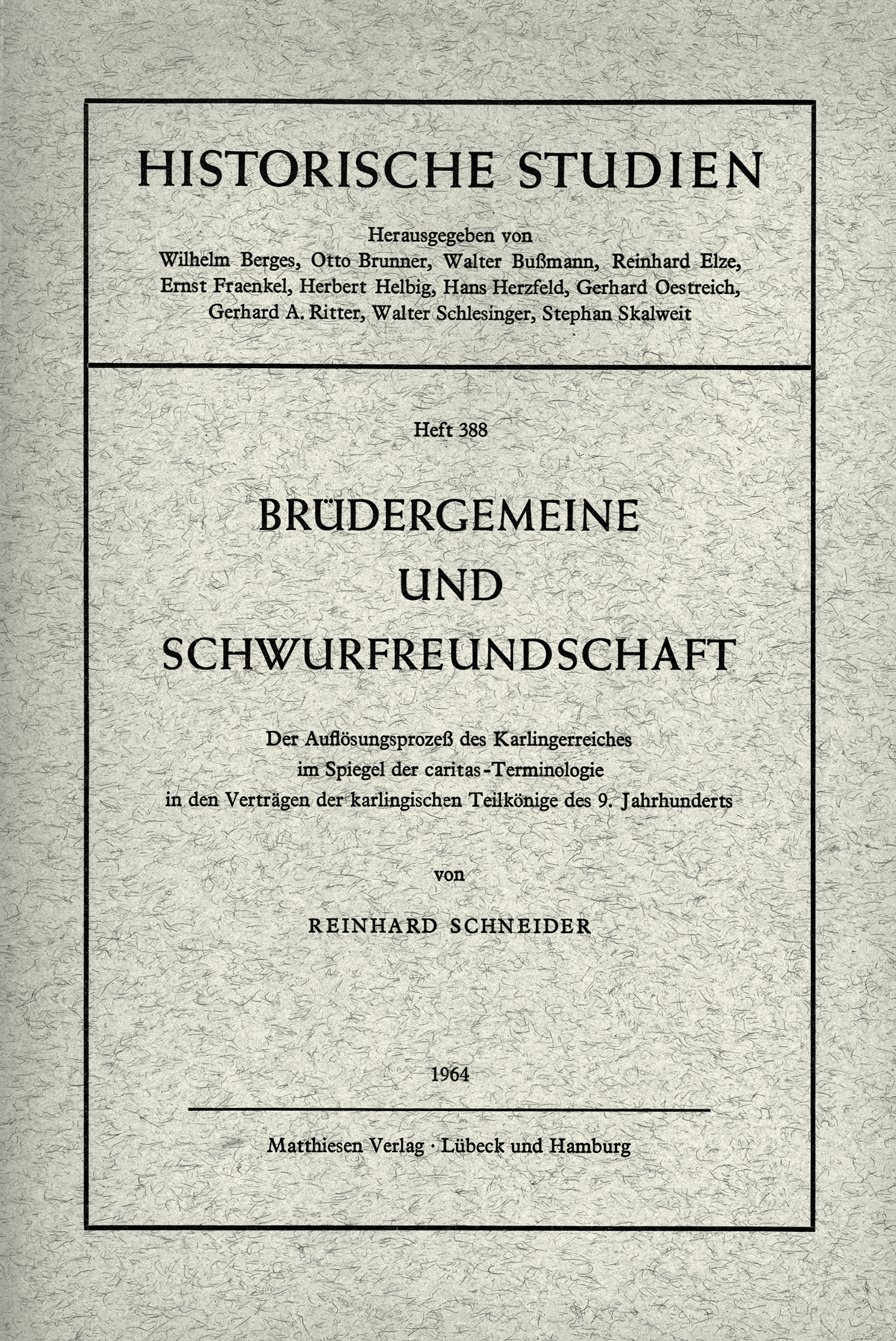 Indem Reinhard Schneider die Texte, die die anlässlich von Zusammenkünften karlingischer Könige nach 840 schriftlich fixiert wurden, einer genauen Prüfung unterzieht, ist ihm nicht eigentlich um deren materiellen Gehalt getan. Stattdessen zielt er darauf ab, den Charakter der Verträge und die in ihnen zwischen den fränkischen Teilherrschern hergestellten Rechtsbeziehungen mithilfe der Termini zu erhellen, mit denen die Verträge diese Rechtsbeziehungen bezeichneten. Zu diesem Zweck untersucht er zunächst formalen Charakter, Funktion und Rechtsbedeutung der Vertragstexte, bevor er den zentralen Begriff ihrer Ideenwelt einer eingehenden Analyse unterzieht. Dabei wird dieser auf seinen profanen klassischen Wortsinn, die christliche Bedeutungsentwicklung sowie die Provenienz seines speziellen Formelgutes geprüft, betrachtet werden zudem sein Eindringen und seine Funktion in der franko-lateinischen Rechtssprache. Daran anschließend bietet Schneider eine Interpretation des caritas-Begriffs in seiner profanrechtlichen Bedeutung innerhalb der untersuchten Karlingerverträge, wo er in Auseinandersetzung mit dem christlichen caritas-Gedanken steht. Zuletzt in den Fokus gerückt wird das Verhältnis von Brüdergemeine und Schwurfreundschaft als der beiden um den profanen caritas-Begriff gelagerten germanischen Rechtsinstitute; hier insbesondere spiegelt sich der Zerfallsprozess des Karlingerreichs in der caritas-Terminologie der Königsverträge.