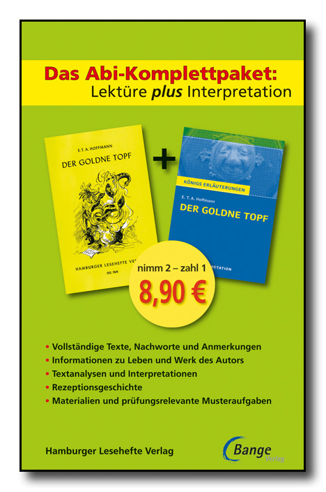 Das Abi-Komplettpaket vom Hamburger Lesehefte Verlag und Bange Verlag bietet alles für eine optimale Vorbereitung auf das Deutschabitur: vollständige Texte, Nachworte und Anmerkungen, Informationen zu Leben und Werk des Autors, Textanalysen und Interpretationen, Rezeptionsgeschichte sowie Materialien und prüfungsrelevante Musteraufgaben und das alles zu einem unschlagbaren Preis. Im Paket enthalten sind jeweils ein Hamburger Leseheft sowie ein Heft Königs Erläuterungen.